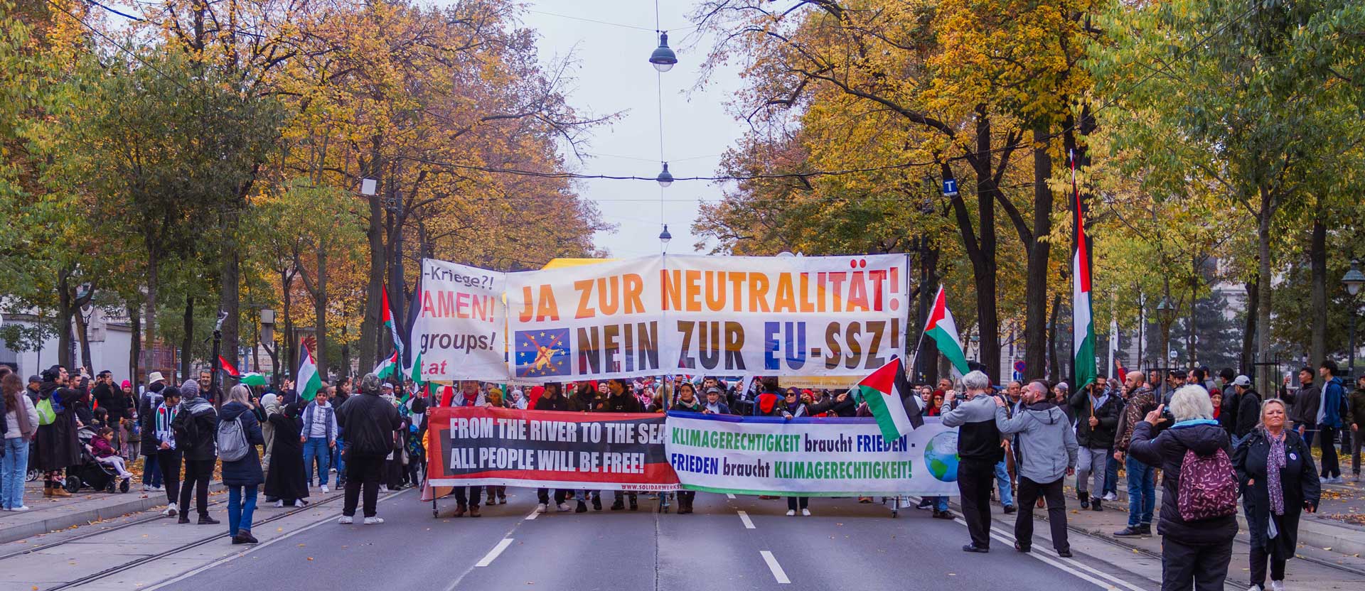 Am 26. Oktober 2024 (Nationalfeiertag) veranstaltet das Bündnis „Stimmen für Neutralität“ und die Solidarwerkstatt eine Kundgebung und Demonstration zum „Denkmal der Republik“ neben dem österreichischen Parlament. Der Inhalt der Kundgebung ist einfach umschrieben „Für Neutralität und Frieden“. Diesem Motto sind auch viele palästina-solidarische Menschen gefolgt, welche auch die Atmosphäre dieser Veranstaltung mit prägten.
