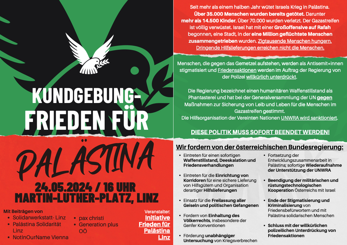 Rede auf der Demo für Frieden in Palästina in Linz am 24.5.