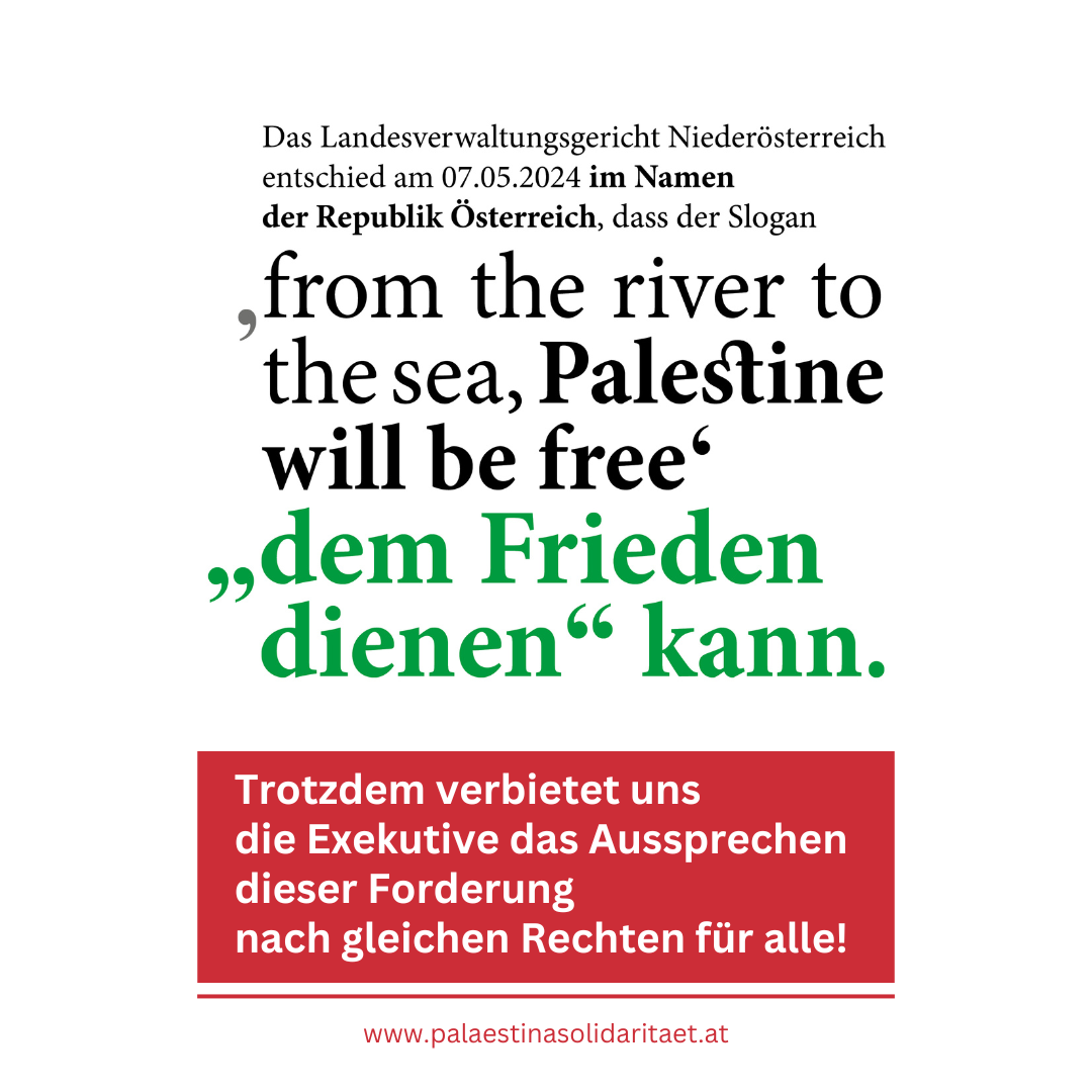 Verwaltungsrichter: „’From the river to the sea, Palestine will be free’ kann dem Frieden dienen” Am 7. Mai 2024 hat des Landesverwaltungsgericht Niederösterreich (LVWG) in St. Pölten die behördliche Untersagung der „Mahnwache und Demo für einen sofortigen Waffenstilland in Gaza“ als rechtswidrig aufgehoben. Die von Walter Höller, Vertreter der Palästina Solidarität Wiener Neustadt, angemeldete Demo war von der Polizei verboten worden, weil dieser mehrfach bei solchen Gelegenheiten den Slogan „From the river to the sea, Palestine will be free“ skandiert ...