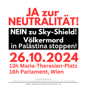 Datum: Samstag, 2. November 2024Uhrzeit: 14 UhrOrt: Columbusplatz, 1100 Wien Seit über einem Jahr begeht Israel einen aktiven Völkermord an den Palästinenser:innen vor den Augen der Weltöffentlichkeit. Dieser wird unvermindert und vorbehaltlos von den Regierungen westlicher Staaten unterstützt, allen voran von den Vereinigten Staaten. Nicht nur hat Israel sein Massenmorden nicht ...