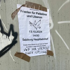 Wie wir bereits veröffentlichten, wurde auf einem Plakat für die Demonstration „Freiheit für Palästina“, die am 13.10.2024 in Salzburg stattfand, der Kommentar „UND IHR VERDIENT EINEN KOPFSCHUSS“ hinterlassen. Es handelt sich hierbei um keinen Einzelfall. Immer öfter führt der in der Öffentlichkeit geschürte Hass gegen Menschen mit Migrationshintergrund und die Diffamierung der ...