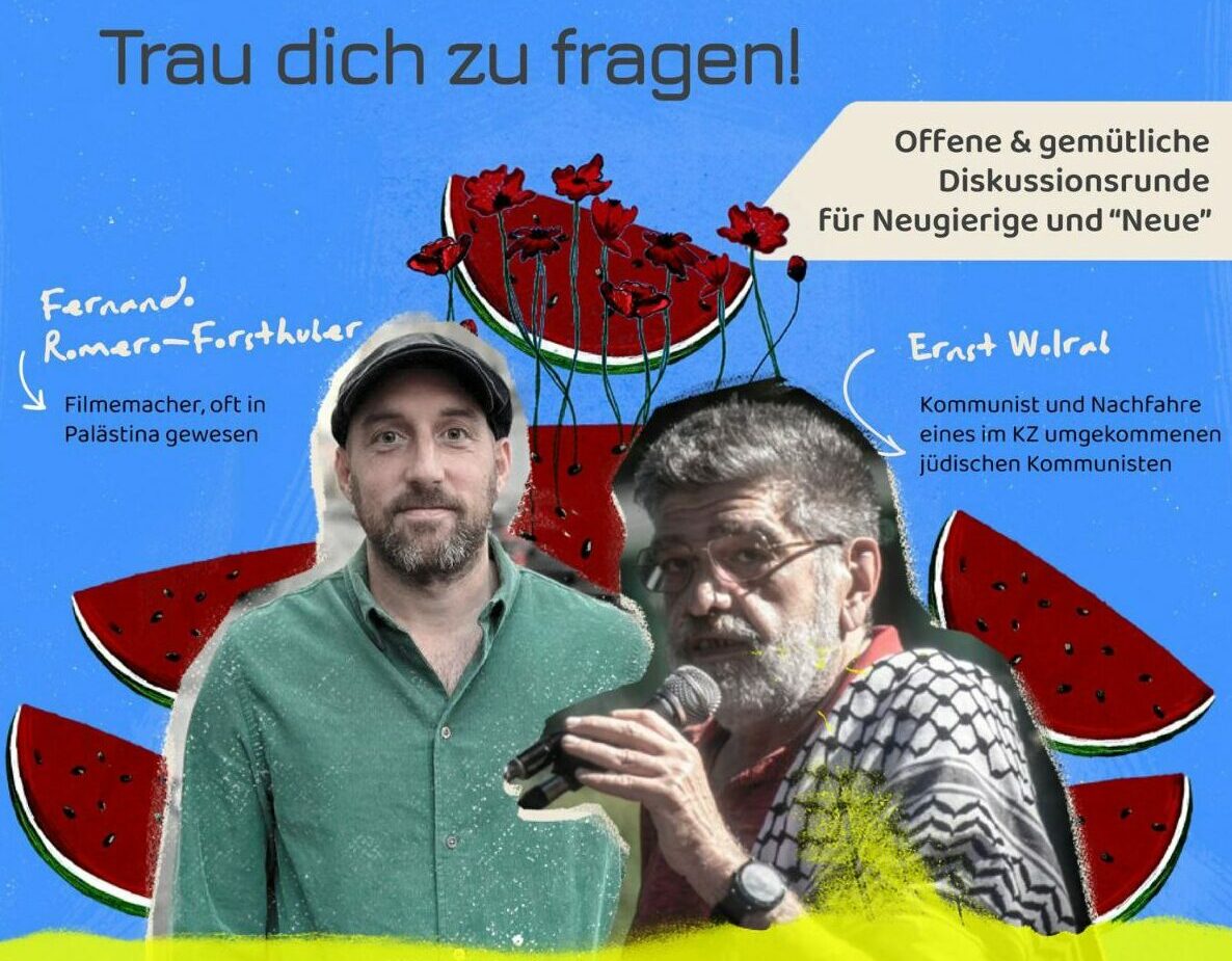 Offene und gemütliche Diskussionsrunde! Was wolltest du schon immer über den Konflikt um Palästina wissen? Trau dich zu fragen! Mit Fernando Romero-Forsthuler Filmemacher, oft in Palästina gewesen, und Ernst Wolrat, Kommunikst und Nachfahre eines im KZ umgekommenen jüdischen Kommunisten. Rögergasse 24-26, 1090, Wien. Eintritt ...